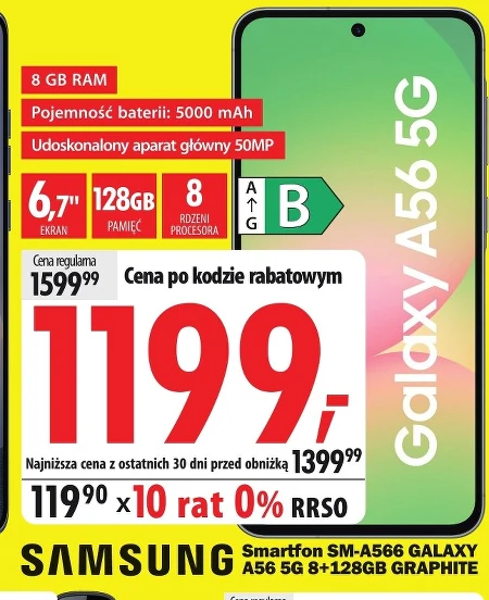 Smartfon Samsung Galaxy A56 5G z 8 GB RAM i 128 GB pamięci to wydajne urządzenie wyposażone w 6,7-calowy ekran i procesor ośmiordzeniowy. Dzięki baterii o pojemności 5000 mAh zapewnia długi czas pracy, a udoskonalony aparat 50 MP pozwala na robienie wysokiej jakości zdjęć. Aktualnie w Media Expert można go nabyć w atrakcyjnej cenie 1199 zł z kodem rabatowym, a dodatkowo sklep oferuje możliwość rozłożenia płatności na 10 rat 0%.