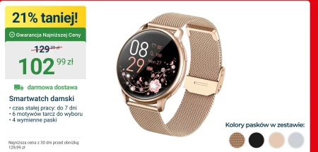 Smartwatch damski · czas stałej pracy: do 7 dni · 6 motywów tarcz do wyboru · 4 wymienne paski Najniższa cena z 30 dni przed obniżką: 129,99 zł