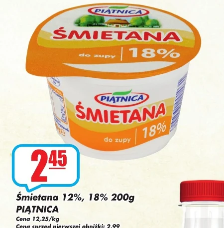 Śmietana 12%, 18% 200g PIĄTNICA Cena 12,25/kg Cena sprzed pierwszei obniżki: 2.99