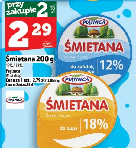 Śmietana 200 g, dostępna w ofercie Topaz, kosztuje 2,79 zł za sztukę, a przy zakupie dwóch opakowań cena spada do 4,58 zł, co daje 2,29 zł za sztukę. Produkt dostępny jest w dwóch wersjach: 12% i 18% tłuszczu. Jest to uniwersalny składnik, idealny do wielu potraw, zarówno na słodko, jak i na słono - sprawdzi się w zupach, sosach, deserach czy kawie. Warto skorzystać z tej okazji i zaopatrzyć się w wysokiej jakości śmietanę w atrakcyjnej cenie. Oferta ważna od 2026-04-16 do 2026-04-22 Źródło: gazetka Topaz