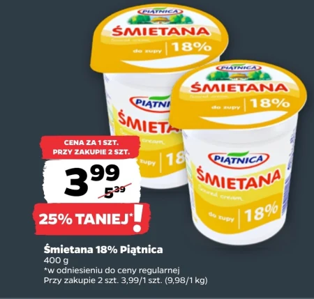 Śmietana 18% Piątnica 400 g *w odniesieniu do ceny regularnej Przy zakupie 2 szt. 3,99/1 szt. (9,98/1 kg)