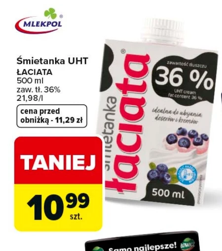 Śmietanka UHT ŁACIATA 500 ml zaw. tł. 36% 21,98/l cena przed obniżką - 11,29 zł