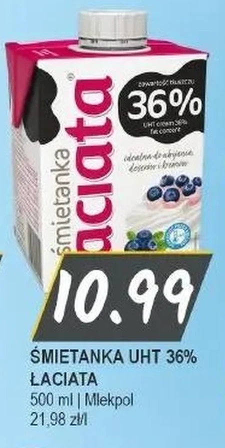Śmietanka UHT 36% marki ŁACIATA, dostępna w markecie Sloneczko, kosztuje 10,99 za opakowanie 500 ml, co daje cenę 21,98 zł za litr. To kremowa śmietanka, idealna do kawy, deserów, sosów, a także jako dodatek do wielu dań kuchni polskiej i międzynarodowej. Jej bogaty smak i konsystencja sprawiają, że przygotowane z nią potrawy zyskują wyjątkowy charakter, a Ty możesz cieszyć się pysznymi efektami bez zbędnego wysiłku. Warto zaopatrzyć się w tę poręczną śmietankę, gdy chcesz szybko i łatwo wzbogacić smak swoich ulubionych potraw.