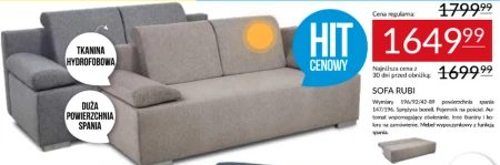 SOFA RUBI Wymiary 196/92/42-89 powierzchnia spania 147/196. Sprężyna bonell. Pojemnik na pościel. Au- tomat wspomagający otwieranie. Inne tkaniny i ko- lory na zamówienie. Mebel wypoczynkowy z funkcją