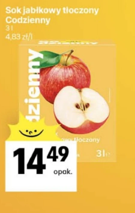 Sok jabłkowy tłoczony Codzienny, 3 l, 4,83 zł/l. Naturalny sok jabłkowy tłoczony, dostępny w dużym, ekonomicznym opakowaniu 3-litrowym. Sok tłoczony Codzienny to produkt wysokiej jakości, wytwarzany ze starannie wybranych jabłek, bez dodatku cukru i konserwantów. Doskonały do picia na co dzień, jako zdrowa alternatywa dla napojów gazowanych — idealny dla całej rodziny, w tym dla dzieci. Duże opakowanie 3 litrów zapewnia długotrwałe zaopatrzenie w witaminy i minerały.
