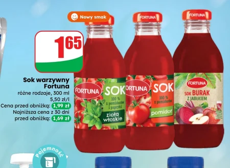 Sok warzywny Fortuna w Dino można kupić teraz za 1,65 zł za butelkę o pojemności 300 ml, co daje 5,50 zł za litr. Dostępne są różne rodzaje tego soku, pozwalające na urozmaicenie codziennej diety. Produkt został przeceniony z 1,99 zł, a najniższa cena z ostatnich 30 dni wynosiła 1,69 zł. Ten sok idealnie sprawdzi się jako szybkie i zdrowe uzupełnienie posiłku lub orzeźwiający napój w ciągu dnia. Skorzystaj z tej okazji i zaopatrz się w ulubiony smak w atrakcyjnej cenie.