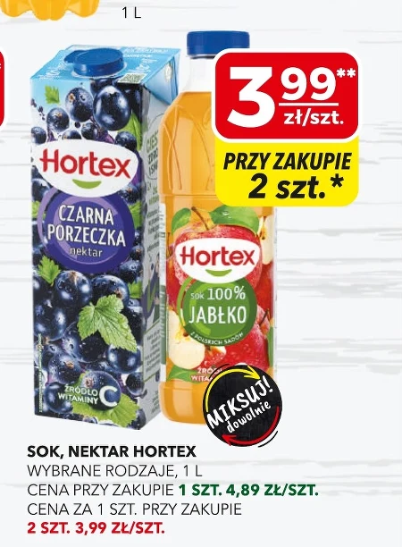 SOK, NEKTAR HORTEX WYBRANE RODZAJE, 1 L CENA PRZY ZAKUPIE 1 SZT. 4,89 ZŁ/SZT. CENA ZA 1 SZT. PRZY ZAKUPIE 2 SZT. 3,99 ZŁ/SZT.