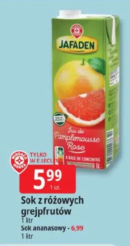 Sok z różowych grejpfrutów E.Leclerc w cenie 5,99 zł za 1 litr jest teraz dostępny w promocji. Aktualnie sok ananasowy kosztuje 6,99 zł za 1 litr, co pozwala na porównanie cen i wybór najlepszej oferty. Możesz wykorzystać ten sok do przygotowania orzeźwiających koktajli lub po prostu napić się go jako zdrową alternatywę dla słodkich napojów. Promocja obowiązuje na 1 sztukę.