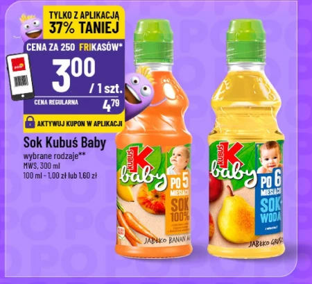 Sok Kubuś Baby wybrane rodzaje ** MWS, 300 ml 100 ml - 1,00 zł lub 1,60 zł