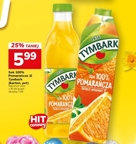 Sok 100% pomarańczowy Tymbark w kartonie lub butelce PET o pojemności 1 litra jest dostępny w Hitpol w cenie 5,99. To naturalny napój, idealny na śniadanie lub jako orzeźwienie w ciągu dnia, bogaty w witaminę C. Aktualnie możesz go nabyć w wyjątkowo atrakcyjnej cenie, ponieważ jest aż 25% tańszy niż najniższa cena z ostatnich 30 dni, która wynosiła 7,99. Skorzystaj z okazji i zaopatrz się w pyszny i zdrowy sok.