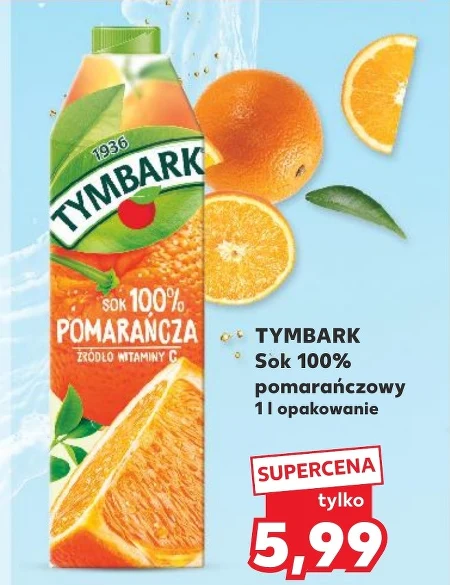 Sok 100% pomarańczowy Tymbark w opakowaniu 1 litra znajdziesz w promocji w Kauflandzie za jedyne 5,99 zł. To naturalny napój bez dodatku cukru, który doskonale sprawdzi się jako orzeźwiający dodatek do śniadania, przekąski czy posiłku w ciągu dnia. Wyciskany z dojrzałych pomarańczy sok zachowuje pełnię smaku i witamin, idealnie komponując się zarówno z zimnymi, jak i ciepłymi daniami. Skorzystaj z okazji, zanim oferta się skończy – to świetna cena za litr czystego soku. Oferta ważna od 2026-04-23 do 2026-04-28 Źródło: gazetka Kaufland