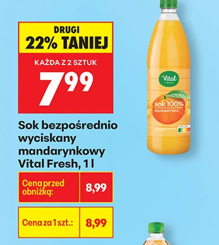 Sok bezpośrednio wyciskany mandarynowy Vital Fresh, o pojemności 1 l, jest dostępny w ofercie Biedronka w cenie 8,99 zł. Przy zakupie dwóch sztuk, każda kolejna jest tańsza o 22% i kosztuje 7,99 zł. Ten naturalny sok to doskonały sposób na dostarczenie witamin i energii, idealny do picia samodzielnie lub jako składnik zdrowych koktajli. Warto skorzystać z tej okazji, by zaopatrzyć się w pyszny i pełen wartości sok mandarynowy.