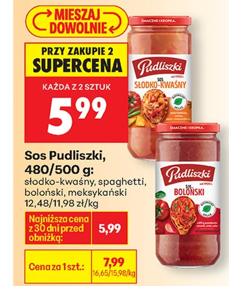 Sos Pudliszki, 480/500 g: słodko-kwaśny, spaghetti, boloński, meksykański 12,48/11,98 zł/kg