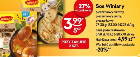 Sos Winiary pieczeniowy ciemny, pieczeniowy jasny, pieczarkowy 27-30 g; 133,00-147,78 zł/kg cena poza zestawem: 5,50 zł; 183,33-203,70 zł/kg Najniższa cena: 4,99 zł** Wartość obniżki w zestawie: -20%**
