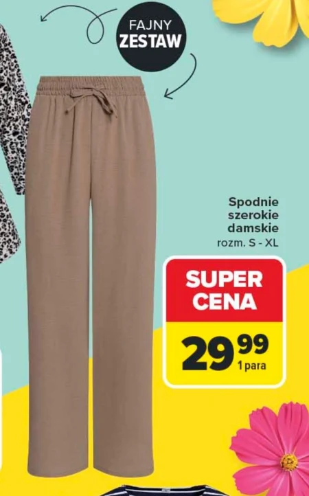 Spodnie szerokie damskie w rozmiarach od S do XL można nabyć w ofercie Carrefour w super cenie 29,99 za jedną parę. Ten model odznacza się luźnym krojem, który zapewnia swobodę ruchów i wygodę podczas codziennego noszenia. Produkt stanowi praktyczny element garderoby dopasowany do różnych sylwetek dzięki dostępności wielu rozmiarów. Warto skorzystać z tej okazji cenowej i uzupełnić szafę o wygodne spodnie. Oferta ważna od 2026-04-07 do 2026-04-18 Źródło: gazetka Carrefour