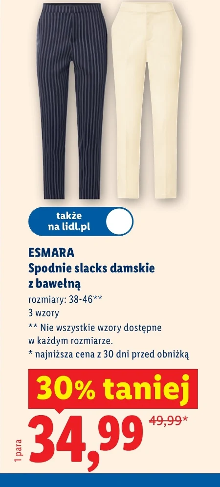 ESMARA Spodnie slacks damskie z bawełną rozmiary: 38-46** 3 wzory ** Nie wszystkie wzory dostępne w każdym rozmiarze. * najniższa cena z 30 dni przed obniżką