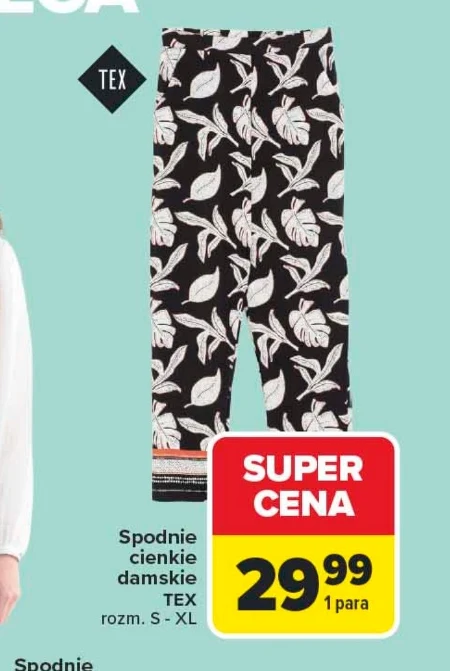 Cienkie spodnie damskie marki TEX są dostępne w ofercie Carrefour w super cenie 29,99 za jedną parę. Produkt występuje w rozmiarach od S do XL. Lekka konstrukcja sprawia, że odzież ta sprawdza się w codziennych stylizacjach wymagających wygody. Warto skorzystać z tej okazji cenowej i nabyć produkt w atrakcyjnej kwocie. Oferta ważna od 2026-04-07 do 2026-04-18 Źródło: gazetka Carrefour