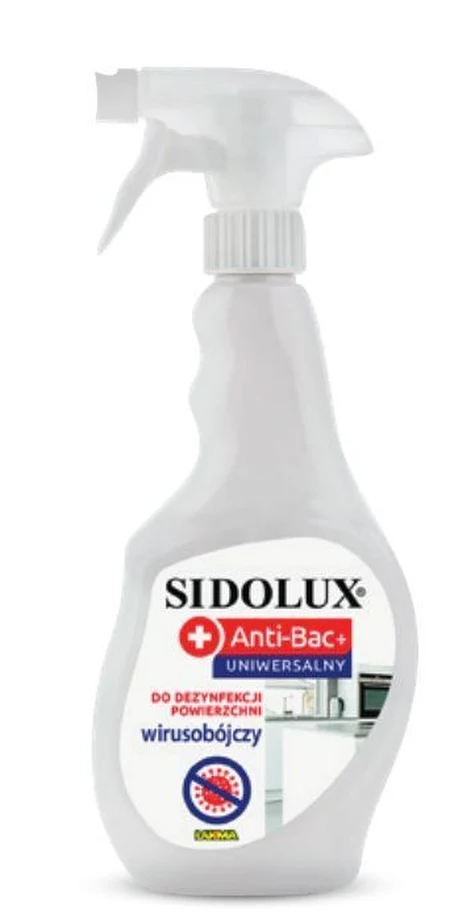 Sidolux Anti-Bac uniwersalny. Środek bakteriobójczy i grzybobójczy do dezynfekcyjnego mycia klamek, umywalek, zlewozmywaków, pryszniców, toalet, wanien, mebli, materacy, zabawek, wykładzin, telefonów i innych wodoodpornych powierzchni wykonanych m.in. z ceramiki, stali nierdzewnej, szkła i tworzyw sztucznych. Cena netto - 18,99 zł.
