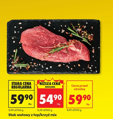 Stek wołowy z łop./krzyż mix występuje w ofercie Biedronka w cenie 54,90 zł/kg, co odpowiada 5,49 zł za 100 gram. Regularnie kosztował 59,90 zł/kg. Ten mięsny produkt idealnie nadaje się do przygotowania soczystych steków, gulaszy lub wołowiny duszonej. To doskonały wybór dla osób poszukujących wysokiej jakości mięsa wołowego w atrakcyjnej cenie. Warto skorzystać z obniżki i zaopatrzyć się w ten produkt, by cieszyć się smacznym posiłkiem. Oferta ważna od 2026-04-10 do 2026-04-30 Źródło: gazetka Biedronka