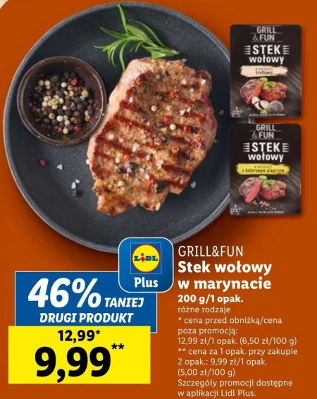 GRILL&FUN Stek wołowy w marynacie 200 g/1 opak. różne rodzaje * cena przed obniżką/cena poza promocją: 12,99 zł/1 opak. (6,50 zł/100 g) ** cena za 1 opak. przy zakupie 2 opak .: 9,99 zł/1 opak. (5,00 zł/100 g) Szczegóły promocji dostępne w aplikacji Lidl Plus.