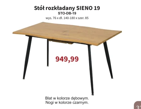 Stół rozkładany SIENO 19 kupisz w ofercie Bodzio w cenie 949,99 zł. Ten funkcjonalny mebel o wymiarach 76 cm wysokości, 140-180 cm długości i 85 cm szerokości, idealnie sprawdzi się w każdym domu. Blat w kolorze dębowym w połączeniu z czarnymi nogami nadaje mu nowoczesny wygląd, który łatwo wkomponuje się w różne aranżacje wnętrz. Rozkładana konstrukcja stołu pozwala na swobodne dostosowanie jego powierzchni do potrzeb, zarówno na co dzień, jak i podczas spotkań z większą liczbą gości.