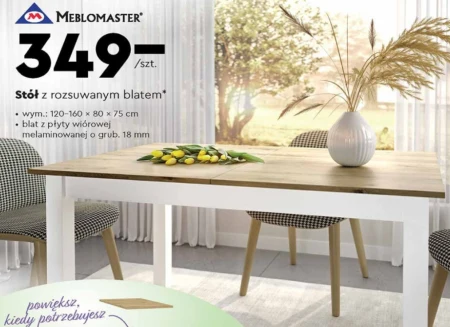 Stół z rozsuwanym blatem, wym. 120-160x80x75 cm. Blat z płyty wiórowej melaminowanej o grubści 18 mm