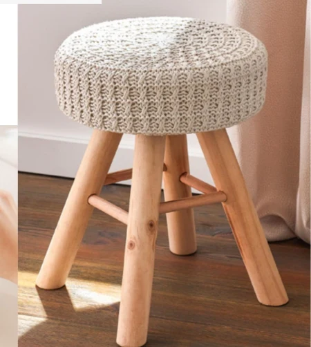 Stołek z dzianinowym pokryciem na drewnianych nogach.