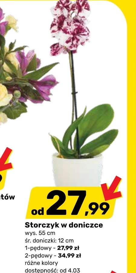 Storczyk w doniczce wys. 55 cm śr. doniczki: 12 cm 1-pędowy - 27,99 zł 2-pędowy - 34,99 zł różne kolory dostępność: od 4.03