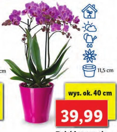 Polski storczyk dwupędowy Multiflora, różne kolory. Średnica doniczki 11,5 cm. Wysokość ok. 40 cm.