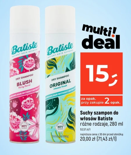 Suchy szampon do włosów Batiste różne rodzaje, 280 ml 53,57 zł/l najniższa cena z 30 dni przed obniżką: 20,00 zł (71,43 zł/I)