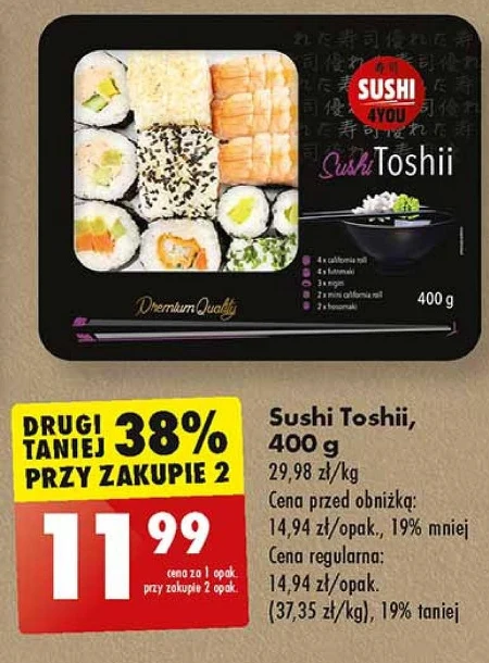 Sushi Toshii, 400 g 29,98 zł/kg Cena przed obniżką: 14,94 zł/opak., 19% mniej Cena regularna: 14,94 zł/opak. (37,35 zł/kg), 19% taniej