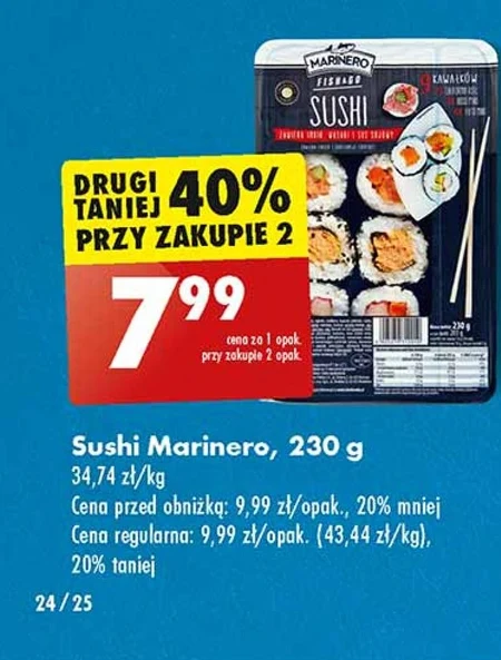 Sushi Marinero, 230 g 34,74 zł/kg Cena przed obniżką: 9,99 zł/opak., 20% mniej Cena regularna: 9,99 zł/opak. (43,44 zł/kg), 20% taniej