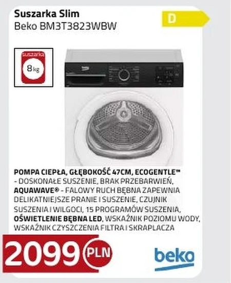 Suszarka Slim Beko BM3T3823W/BW POMPA CIEPŁA, GŁĘBOKOŚĆ 47CM, ECOGENTLE™ - DOSKONAŁE SUSZENIE, BRAK PRZEBARWIEŃ, AQUAWAVE® - FALOWY RUCH BĘBNA ZAPEWNIA DELIKATNIEJSZE PRANIE I SUSZENIE, CZUJNIK SUSZENIA I WILGOCI, 15 PROGRAMÓW SUSZENIA, OŚWIETLENIE BĘBNA LED, WSKAŹNIK POZIOMU WODY, WSKAŹNIK CZYSZCZENIA FILTRA I SKRAPLACZA