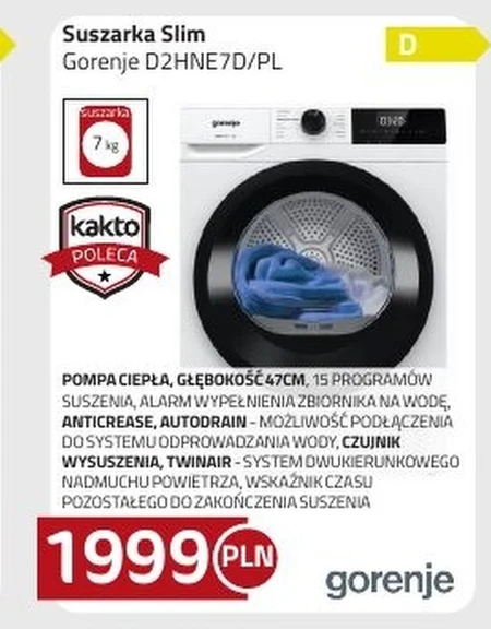 Suszarka Slim Gorenje D2HNE7D/PL POMPA CIEPŁA, GŁĘBOKOŚĆ 47CM, 15 PROGRAMÓW SUSZENIA, ALARM WYPEŁNIENIA ZBIORNIKA NA WODĘ, ANTICREASE, AUTODRAIN - MOŻLIWOŚĆ PODŁĄCZENIA DO SYSTEMUODPROWADZANIA WODY, CZUJNIK WYSUSZENIA, TWINAIR - SYSTEM DWUKIERUNKOWEGO NADMUCHU POWIETRZA, WSKAŹNIK CZASU POZOSTAŁEGO DO ZAKOŃCZENIA SUSZENIA
