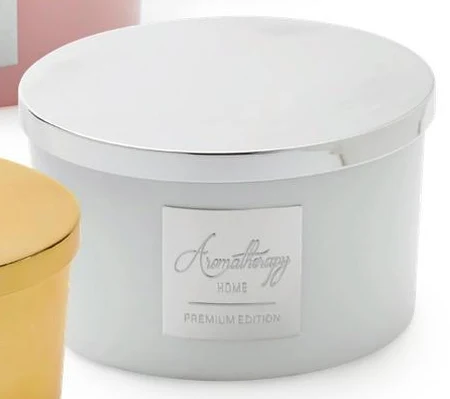 Świeca zapachowa w szklanym pojemniku z metalową przykrywką. Do wyboru różne zapachy, średnica 13,5 cm, wys. 8 cm.