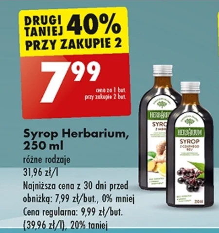 Syrop Herbarium, 250 ml różne rodzaje 31,96 zł/l Najniższa cena z 30 dni przed obniżką: 7,99 zł/but., 0% mniej Cena regularna: 9,99 zł/but. (39,96 zł/l), 20% taniej