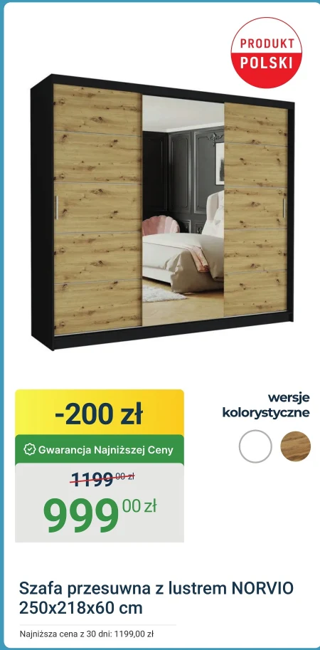 Szafa przesuwna z lustrem NORVIO jest dostępna w ofercie ERLI w cenie 999,00 zł, obniżonej o 200 zł z 1199,00 zł. Mebel o wymiarach 250x218x60 cm to funkcjonalne rozwiązanie do przechowywania ubrań, zapewniające jednocześnie optyczne powiększenie przestrzeni dzięki umieszczonemu lustru. Szafa sprawdzi się w sypialni, pokoju dziennym, a także w garderobie, oferując sporo miejsca na odzież i inne przedmioty. Skorzystaj z gwarancji najniższej ceny i wyposaż swoje wnętrze w praktyczną i elegancką szafę.