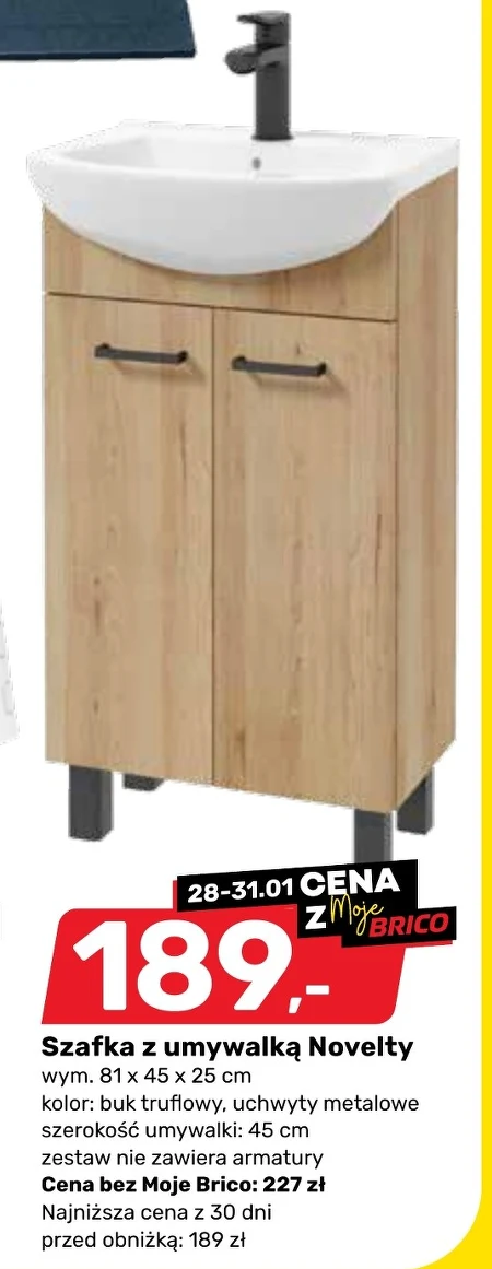 Szafka z umywalką Novelty wym. 81× 45 x 25 cm kolor: buk truflowy, uchwyty metalowe szerokość umywalki: 45 cm zestaw nie zawiera armatury Cena bez Moje Brico: 227 zł Najniższa cena z 30 dni przed obniżką: 189 zł