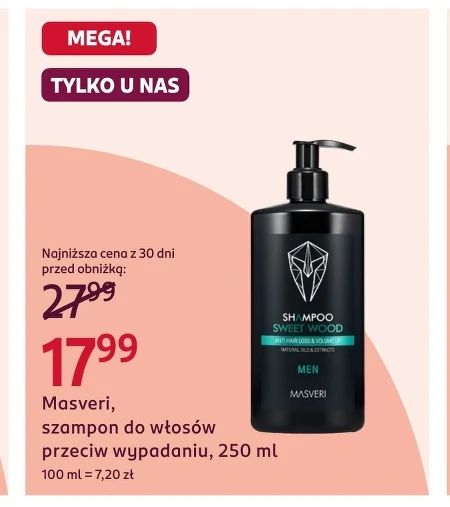Szampon do włosów przeciw wypadaniu, Masveri, jest dostępny w Rossmannie w cenie 17,99 zł za 250 ml, co daje 7,20 zł za 100 ml. To obniżka z 27,99 zł z ostatnich 30 dni. Produkt przeznaczony jest do włosów osłabionych i skłonnych do wypadania, pomagając wzmocnić włosy od nasady i ograniczyć ich utratę. To świetna okazja, by zadbać o kondycję włosów w korzystnej cenie.