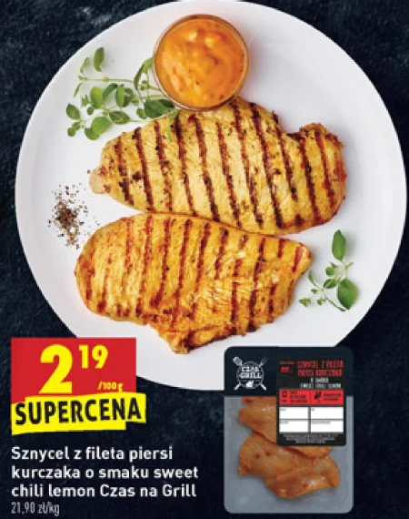 Sznycel z fileta piersi kurczaka o smaku sweet chili lemon. Cena za kg - 21,90 zł.