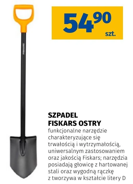 SZPADEL FISKARS OSTRY funkcjonalne narzędzie charakteryzujące się trwałością i wytrzymałością, uniwersalnym zastosowaniem oraz jakością Fiskars; narzędzia posiadają głowicę z hartowanej stali oraz wygodną rączkę z tworzywa w kształcie litery D .