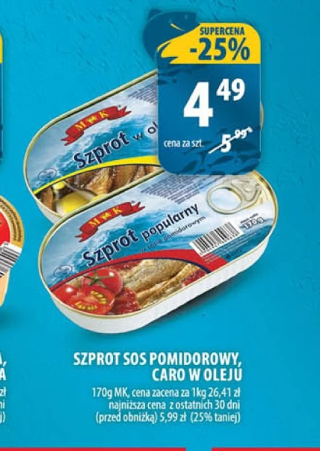 SZPROT SOS POMIDOROWY, CARO W OLEJU 170g MK, cena zacena za 1kg 26,41 zł najniższa cena z ostatnich 30 dni (przed obniżką) 5,99 zł (25% taniej) Gotowe danie, takie jak szprot w sosie pomidorowym, to szybki i smaczny pomysł na obiad lub kolację, idealny dla osób ceniących wygodę i bogaty smak ryb. Konserwa z szprotami w aromatycznym sosie pomidorowym to doskonałe źródło kwasów omega-3 i białka, stanowiąc wartościowy element zdrowej diety, a także świetnie smakuje na kanapkach jako wyśmienita przekąska. Ten pyszny, marynowany w oleju produkt świetnie sprawdzi się w kuchni jako baza do past, dodatku do sałatek czy element deski serów i wędlin.