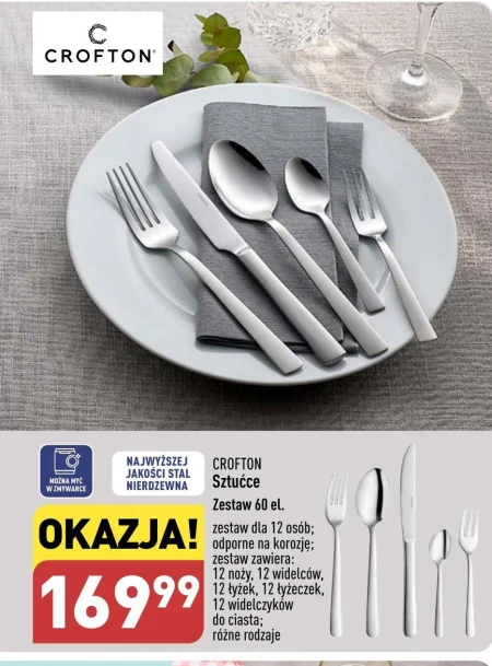 CROFTON Sztućce Zestaw 60 el. zestaw dla 12 osób; odporne na korozję; zestaw zawiera: 12 noży, 12 widelców, 12 łyżek, 12 łyżeczek, 12 widelczyków do ciasta; różne rodzaje