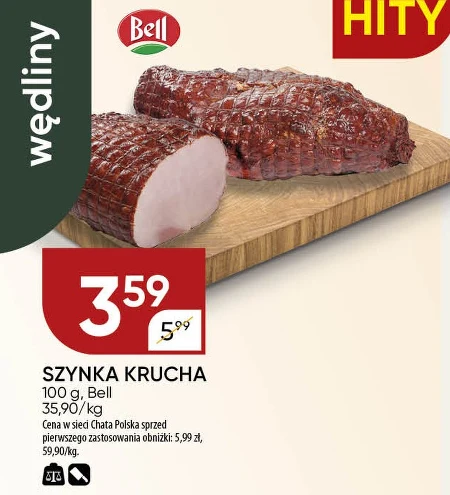 SZYNKA KRUCHA 100 g, Bell 35,90/kg Cena w sieci Chata Polska sprzed pierwszego zastosowania obniżki: 5,99 zł, 59,90/kg.