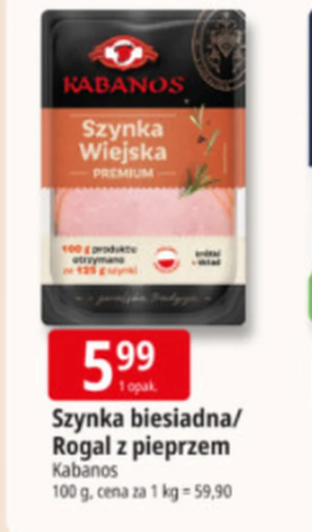 Szynka biesiadna/ Rogal z pieprzem Kabanos 100 g, cena za 1 kg = 59,90