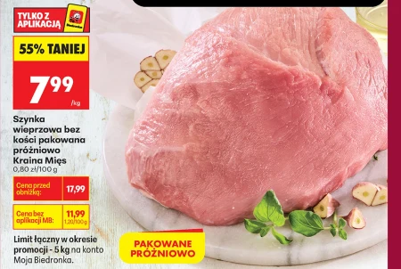 Szynka wieprzowa bez kości pakowana próżniowo Krajina Mięs 0,80 zł/100 g TYLKO Z APLIKACJĄ 55% TANIEJ 7,99 /kg Cena przed obniżką: 17,99 Cena bez aplikacji MB: 17,99/1,200 kg Limit łączny w okresie promocji - 5 kg na konto Moja Biedronka Krajina Mięs prezentuje szynkę wieprzową bez kości, zapakowaną próżniowo, idealną do kanapek, dań gotowych czy jako dodatek do sałatek. Aktualnie w Biedronce, dzięki aplikacji, można ją nabyć w wyjątkowej cenie 7,99 zł za kilogram, co stanowi znaczną obniżkę względem ceny regularnej. Sprawdź gazetkę Biedronki i skorzystaj z oferty, pamiętając o limicie 5 kg na jedno konto Moja Biedronka. To doskonała okazja, by zaopatrzyć się w wysokiej jakości mięso w bardzo atrakcyjnej cenie.