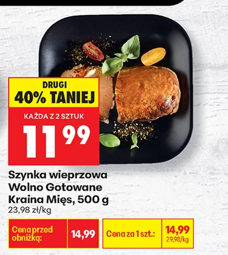 Szyńka wieprzowa Wolno Gotowane Kraina Mięs, 500 g 23,98 zł/kg Cena przed obniżką: 14,99 Cena za 1 szt.: 14,99 29,98/kg DRUGI 40% TANIEJ KAŻDA Z 2 SZTUK 11,99 Szyńka wieprzowa Kraina Mięs, dostępna w promocji w Biedronce, kosztuje 11,99 zł za dwie sztuki o gramaturze 500 g każda. Cena za kilogram przy zakupie dwóch sztuk wynosi 11,99 zł, co oznacza 40% zniżkę względem ceny 29,98 zł/kg. Aktualnie w Biedronce szyńka jest w cenie 14,99 zł, co daje 23,98 zł/kg. Idealna do kanapek i prostych przekąsek.