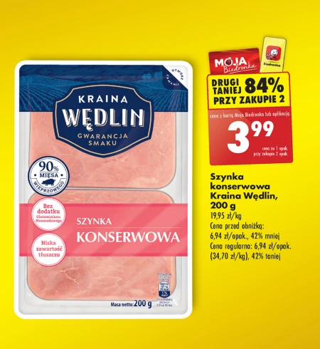 Szynka konserwowa Kraina Wędlin, 200 g 19,95 zł/kg Cena przed obniżką: 6,94 zł/opak., 42% mniej Cena regularna: 6,94 zł/opak. (34,70 zł/kg), 42% taniej