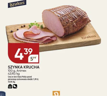 SZYNKA KRUCHA 100 g, Animex 43,90/kg Cena w sieci Chata Polska sprzed pierwszego zastosowania obniżki: 5,99 zł, 59,90 /kg.