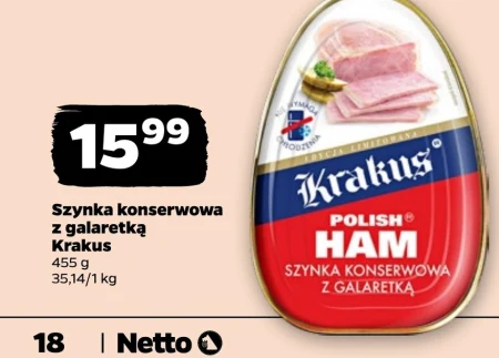 Szyнка konserwowa z galaretką Krakus 455 g 35,14/1 kg Wyśmienita **szynka konserwowa Krakus** z galaretką to idealny składnik na szybkie przekąski, kanapki oraz deski wędlin, dodając smaku każdej okazji. Klasyczny smak **szynki konserwowanej** doskonale sprawdza się w przygotowaniu sałatek, past oraz jako dodatek do pizzy, oferując wygodny sposób na smaczny posiłek. Dzięki zawartości galaretki, **szynka Krakus** pozostaje soczysta i aromatyczna, a jej wysoka jakość sprawia, że jest chętnie wybierana przez klientów ceniących tradycyjne smaki.